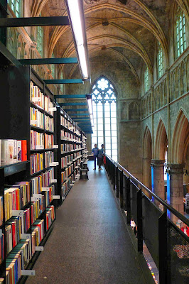 Autrefois avant tout lieu de recueillement et de prière, cette ancienne église dominicaine du 13ème siècle ne désemplit pas puisqu'elle est aujourd'hui transformée en librairie, offrant à ses visiteurs de s'asseoir et de feuilleter les ouvrages avant de faire un choix parmi toutes les œuvres proposées. Avec l'aimable autorisation de B. , quelques photos qui forcent la surprise et l'émerveillement.