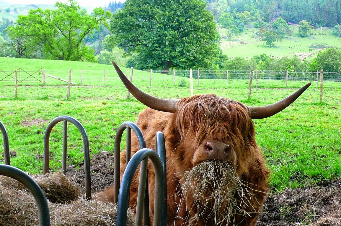 "Hamish est un bœuf Highland pure race. Il est docile et n’est pas dangereux à nourrir si vous prenez garde à ses cornes. Il se nourrit exclusivement de légumes.