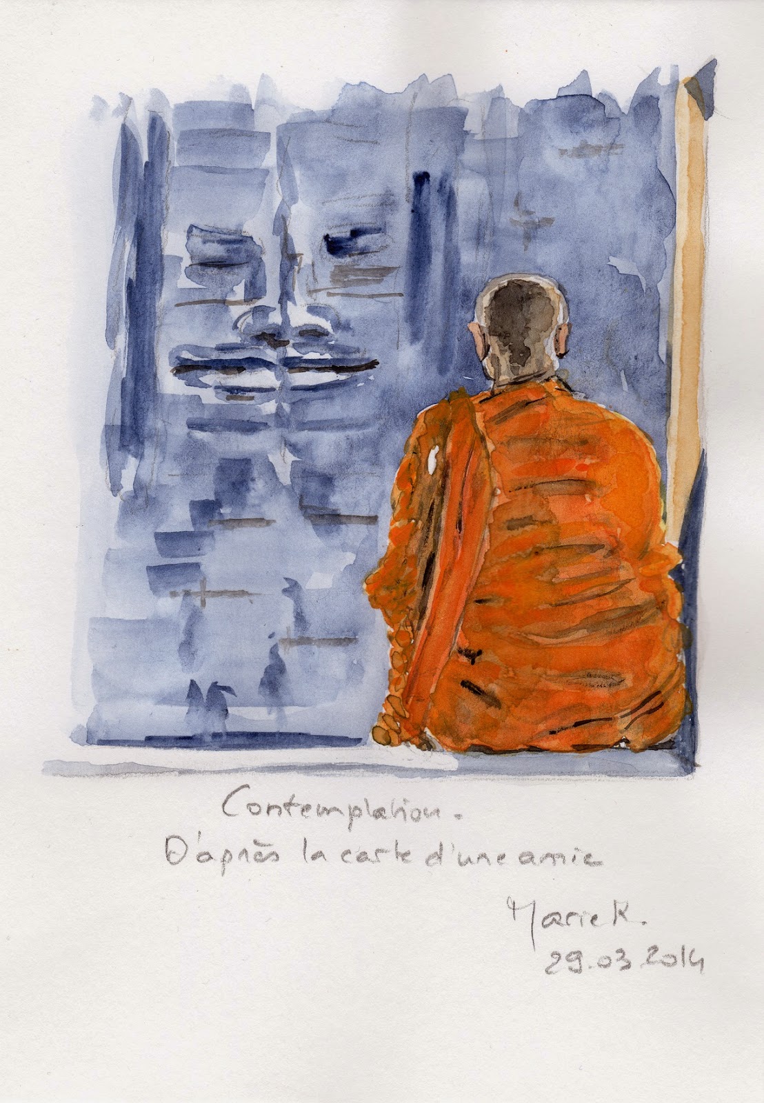 Quelques bricoles à faire et ensuite je viendrai lire vos commentaires de la semaine et y répondre. Bon week-end à tous et à toutes et n'oubliez pas de mettre vos pendules à l'heure d'été dans la nuit. Une heure de sommeil en moins ... Ce n'est pas ce qui me réjouit le plus. Nous nous éloignons d'une heure de l'heure du soleil. Mais ce n'est pas la première aberration concernant nos rythmes de vie à l'époque actuelle. On n'a juste pas le choix !!!! C'est peut-être pour cela que ce moine bouddhiste assis sur le rebord d'une ouverture, contemplant la statue dans la pierre d'un bouddha et prenant le soleil et la lumière m'a tant inspirée. Juste s'asseoir !!!! et être.